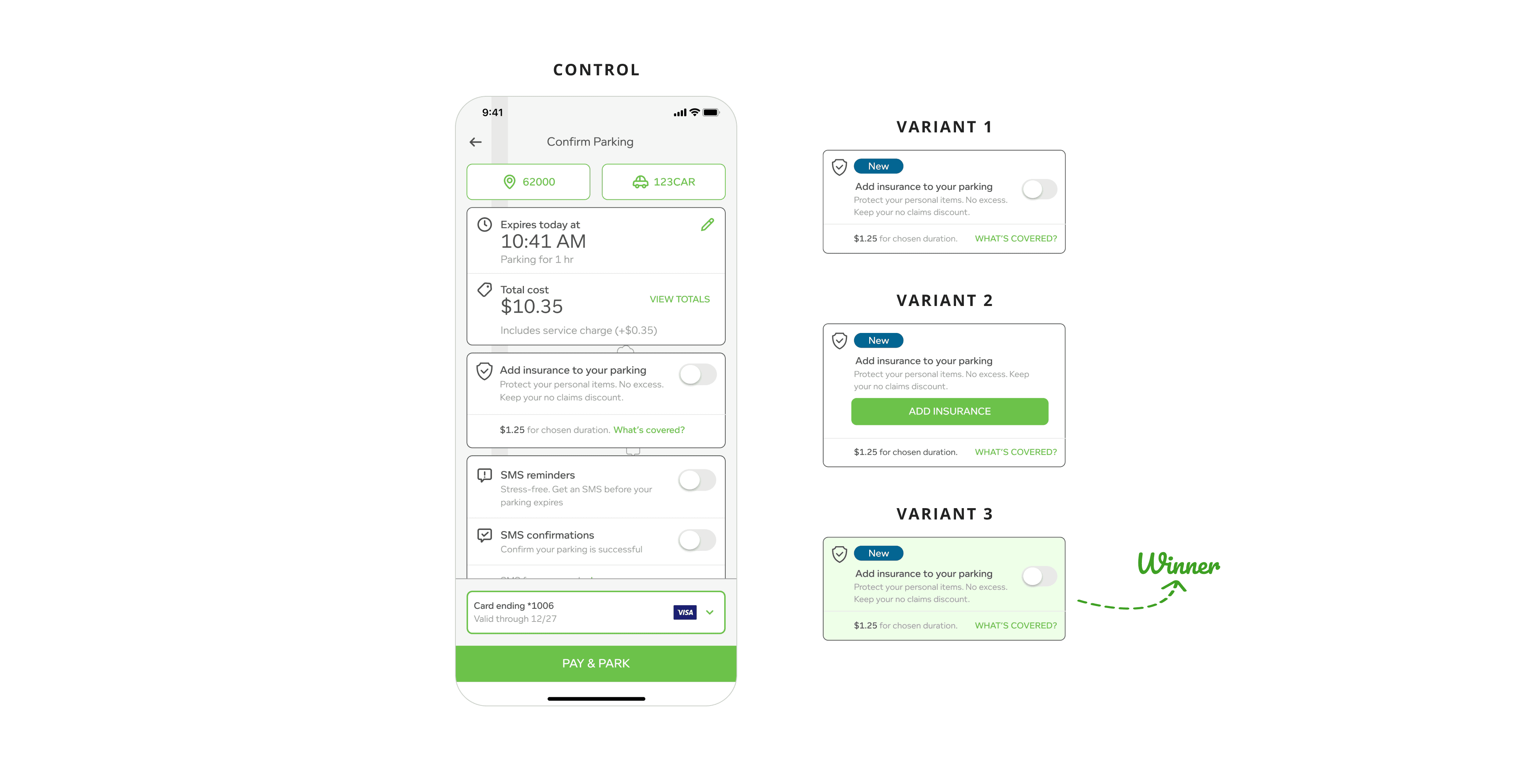 Result: Variant 3 led to a massive +568% increase in users clicking the insurance toggle, successfully unlocking feature adoption.