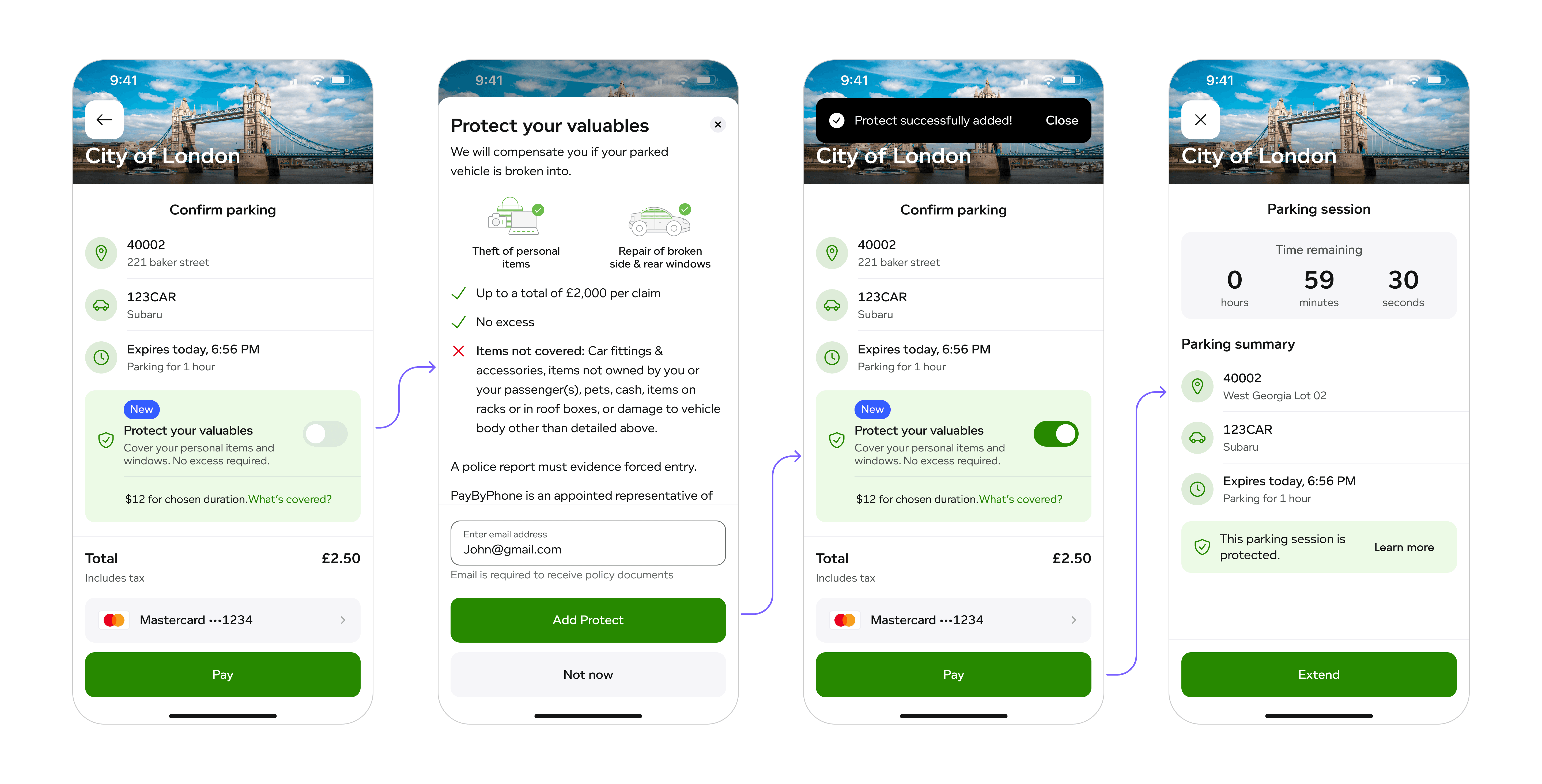 Car break-ins were rising, creating anxiety for users leaving valuables. PayByPhone identified an opportunity to unlock a new revenue stream by offering quick, session-based contents insurance right when users felt most vulnerable.