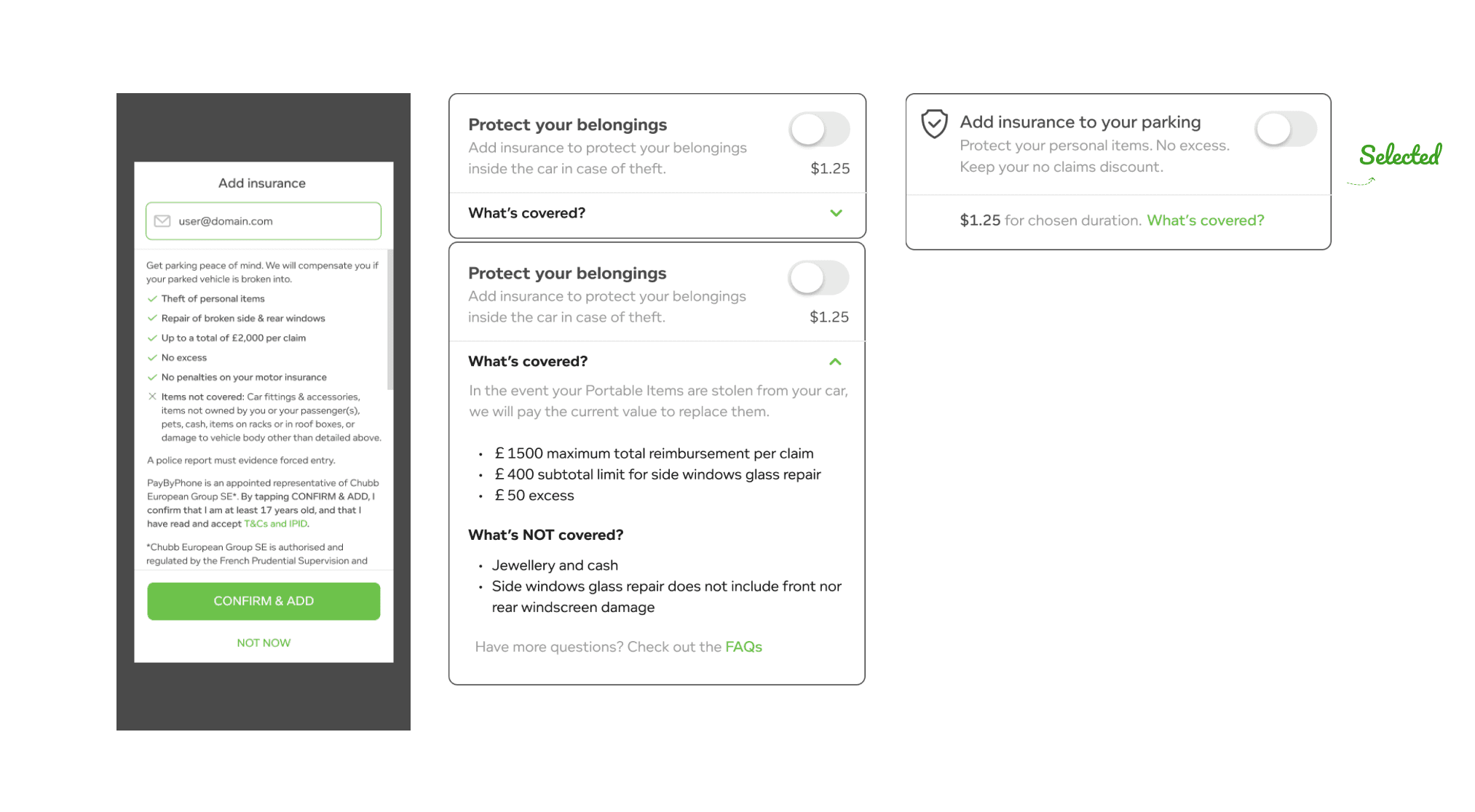 Explorations: Since user research clearly identified that the purchase hinged on seeing the price and coverage details, I explored high-visibility options like a full-screen overlay after duration selection. I rejected this option because, although it offered maximum visibility for the new feature, it added an extra screen into the main flow, forcing a decision and interrupting the core task. This directly violated the Fast & Simple principle. I also rejected the expand/collapse card on the Confirm Parking screen because expanding the feature severely crowded the screen, which could lead to users missing crucial information before tapping to pay.