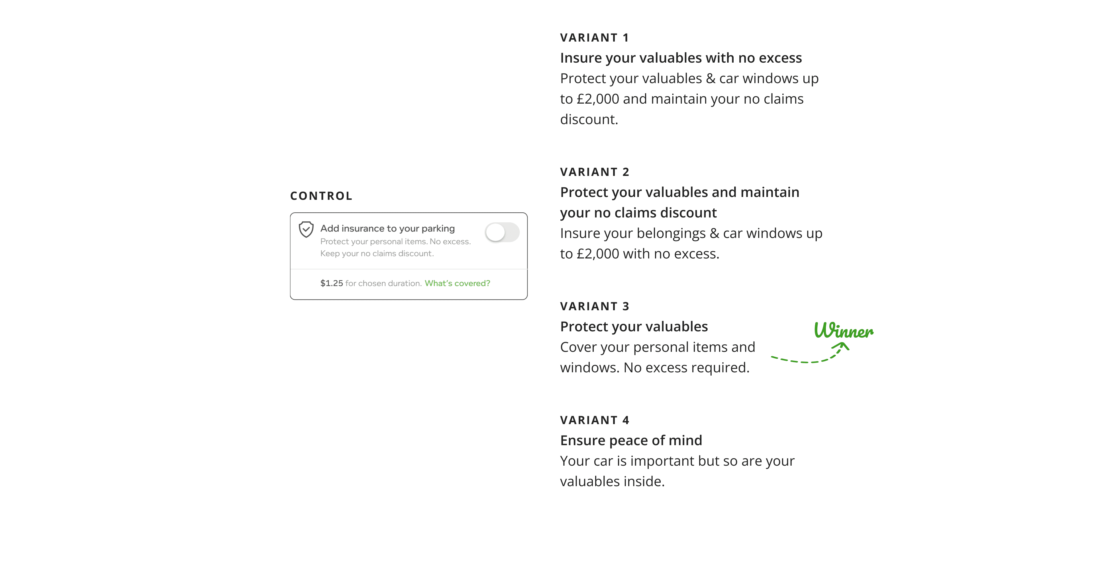 Result: The winning copy (Variant 3) achieved a +60% increase in the attach rate. This result was crucial: it proved that users were not swayed by the emotional promise (Variant 4) or the detailed Control. Instead, they prioritized simple, direct protection language combined with the single, high-value financial incentive of "No excess required.